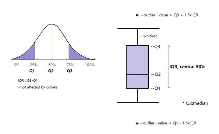 하나의 연속형 변수에 대한 기초 통계량을 그림으로 나타내면 다음과 같은 상자그림을 그릴 수 있습니다. 최소값과 최대값을 상자그림의 위아래 선으로 표시하고, 25%에 해당하는 Q1(1분위수)와 75%에 해당하는 Q3(3분위수)를 상자로 표시합니다. 그리고 50%에 해당하는 Q2(중위수)를 상자 안의 선으로 표시하여, 이 변수의 대략적인 분포를 알 수 있도록 합니다.